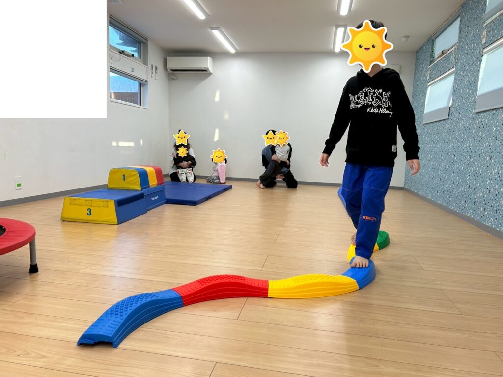 平均台でバランスをとりながら