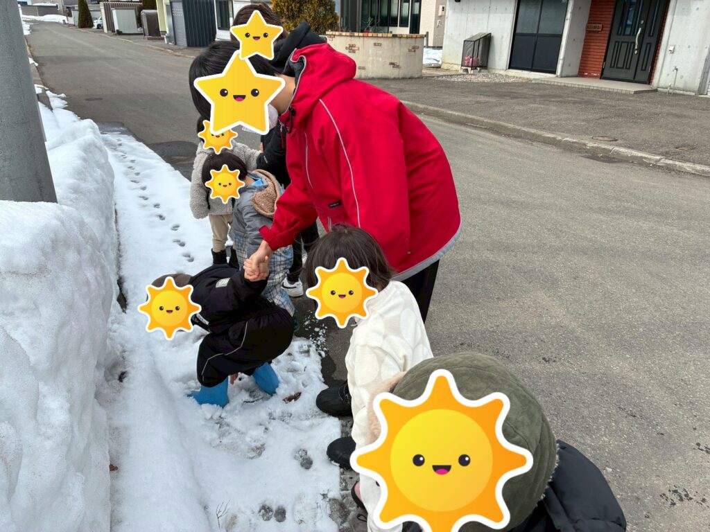 雪道では動物の足跡を見つけ